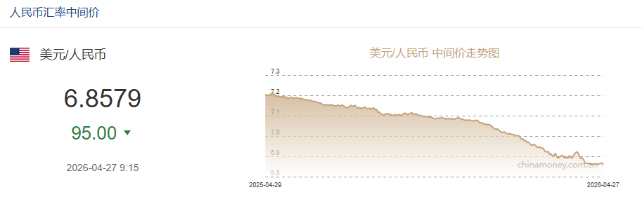 4月27日人民币对美元中间价报6.8579 上调95个基点